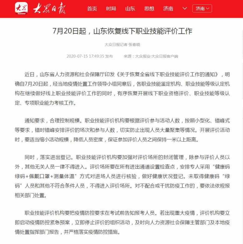 7月20日起,山东恢复线下职业技能评价工作